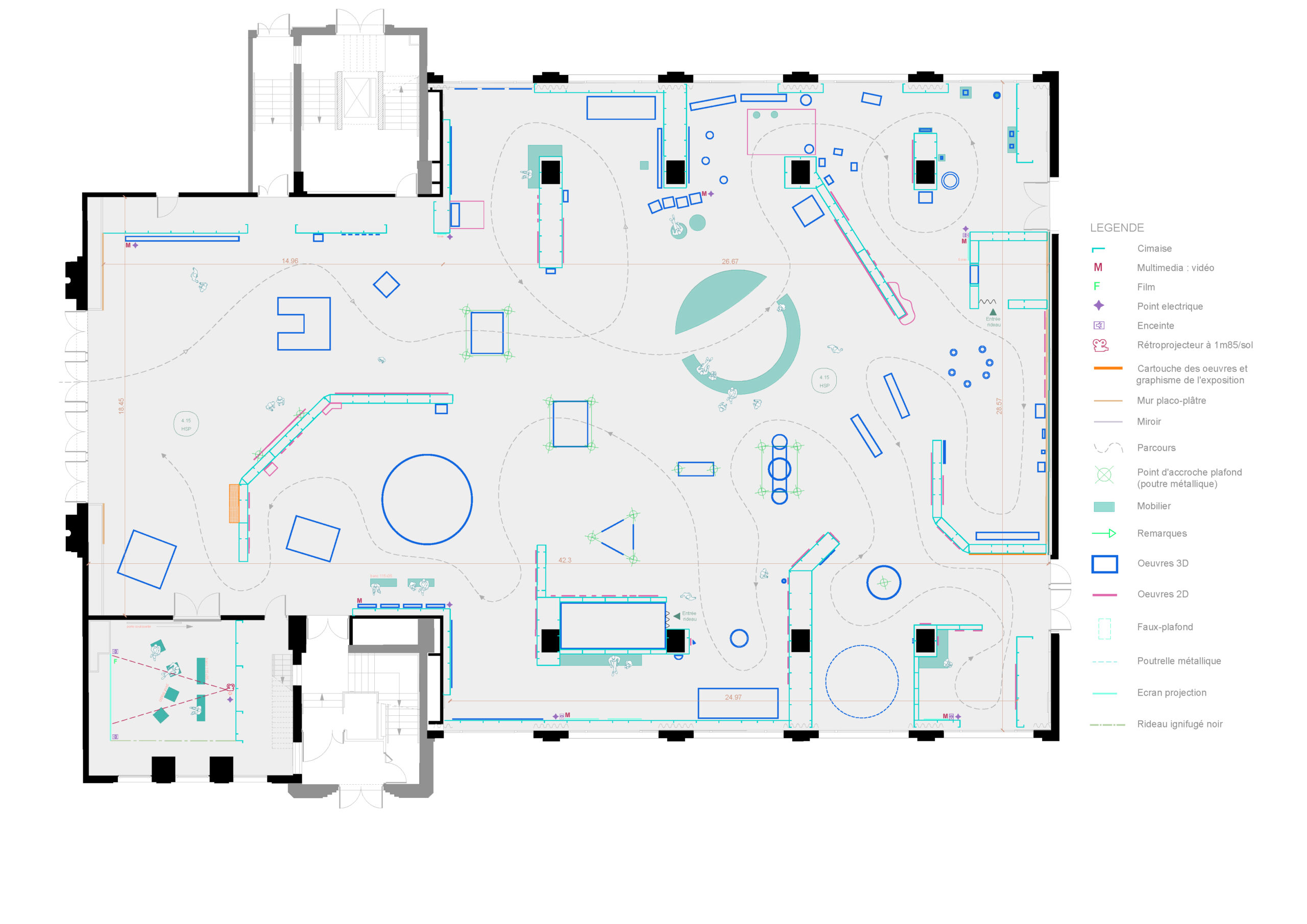 La scénographie s’est voulue la plus claire possible, évitant toute redondance pour laisser à chaque œuvre la place d’exister pleinement. J’ai travaillé les pleins et les vides, sur les perspectives et les lignes de fuite pour créer des horizons, sur des plans successifs qui se répondent et guident le regard du visiteur. Ainsi les diagonales viennent perturber la trame orthogonale de la salle, apportant une dynamique nouvelle et de nouveaux axes de lecture.