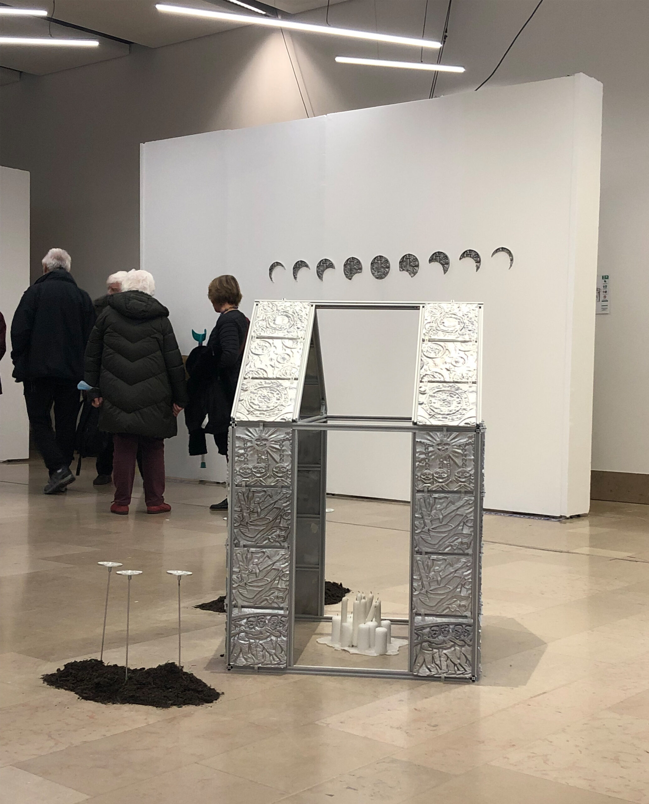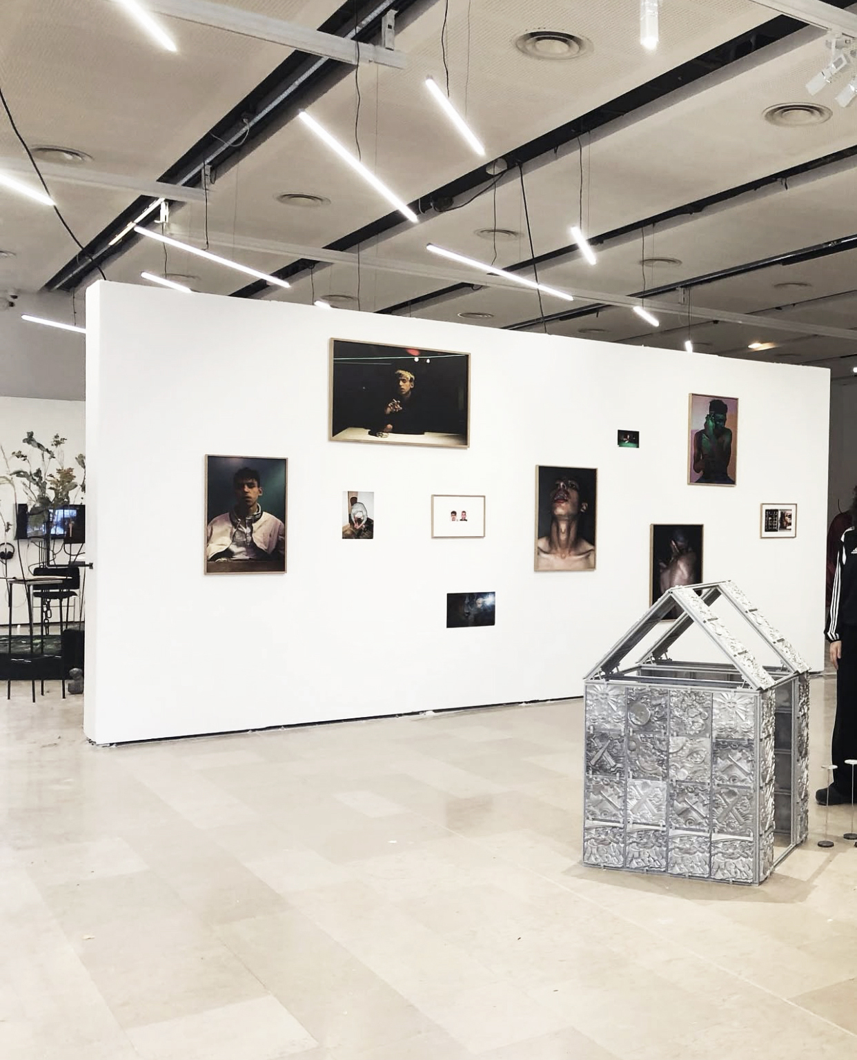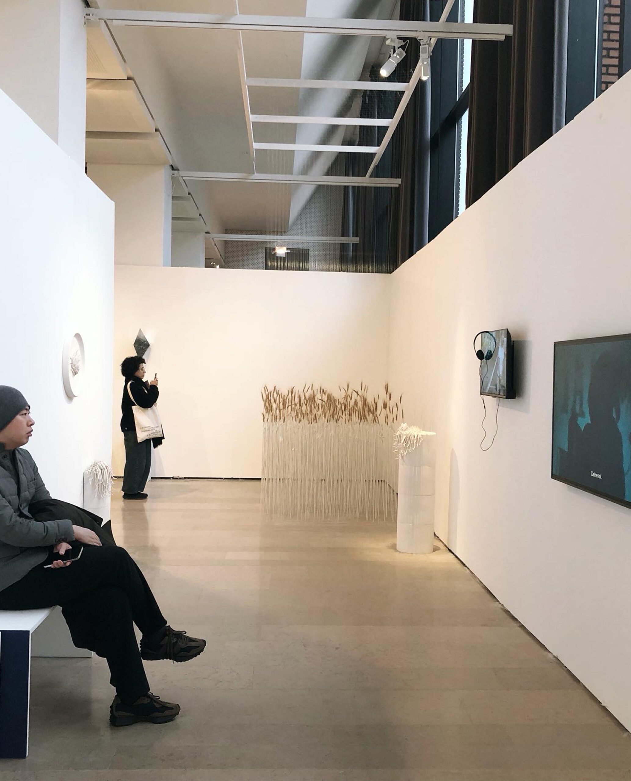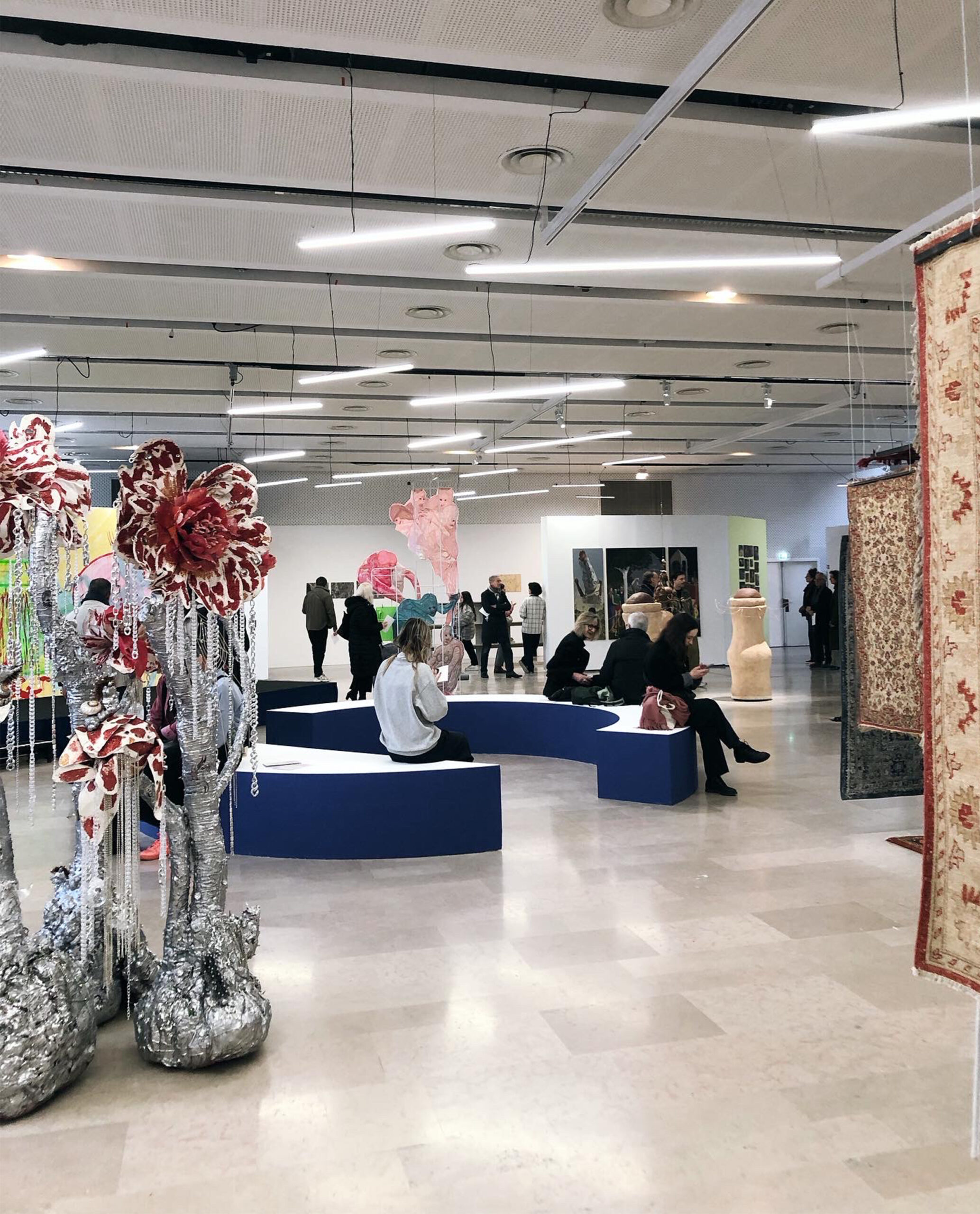 Au cœur de cet agencement, un mobilier central créé sur-mesure en forme circulaire joue le rôle de rotule : il articule l’ensemble du parcours et devient un lieu d’échange pour le public. C’est autour de cette place centrale que se déploient des espaces plus intimes, imaginés pour s’adapter aux spécificités des œuvres présentées, qu’il s’agisse de pièces monumentales ou de formats plus confidentiels. Certaines œuvres de grande taille servent également de repères pour orienter les visiteurs, créant ainsi une signalétique naturelle au sein de l’exposition.